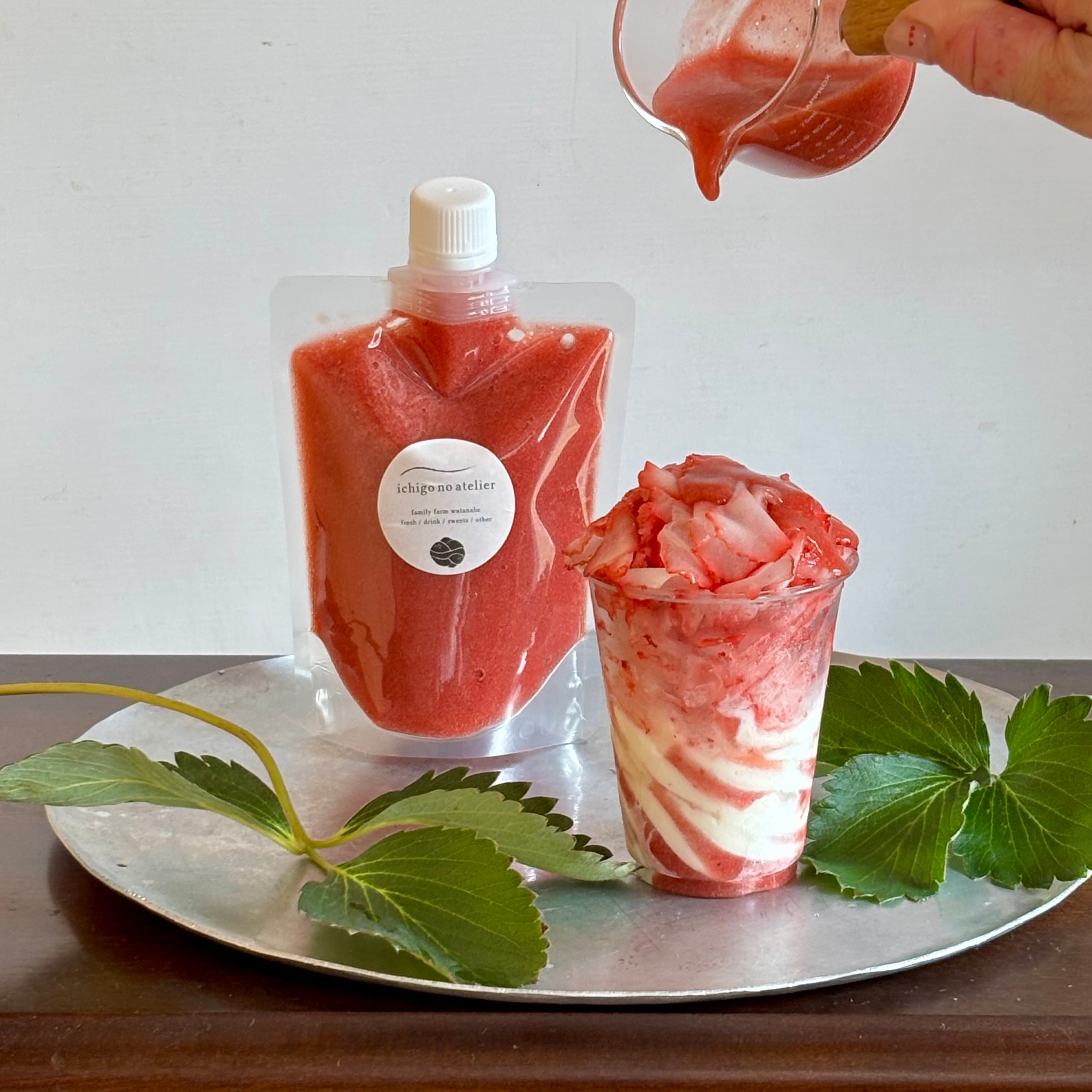 仕上げに「幸せいちごソース」をとろ〜りとかければ、甘酸っぱい苺とやさしいミルクのハーモニーをお楽しみいただけます。